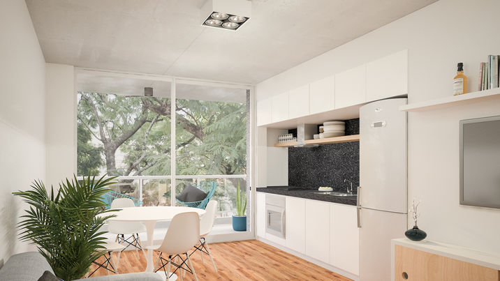 Ubicado en Villa del Parque, en una zonificación de densidad media se desarrolla un edificio residencial y apto profesional de planta baja y 8 pisos. 1 local comercial en PB, 13 unidades funcionales y 1 SUM (salón de usos múltiples) Del 1° al 6°, 2 unidades por piso de 3 ambientes y 2 ambientes, 7° 4 ambientes.